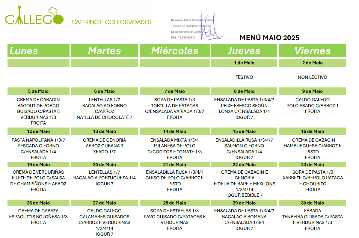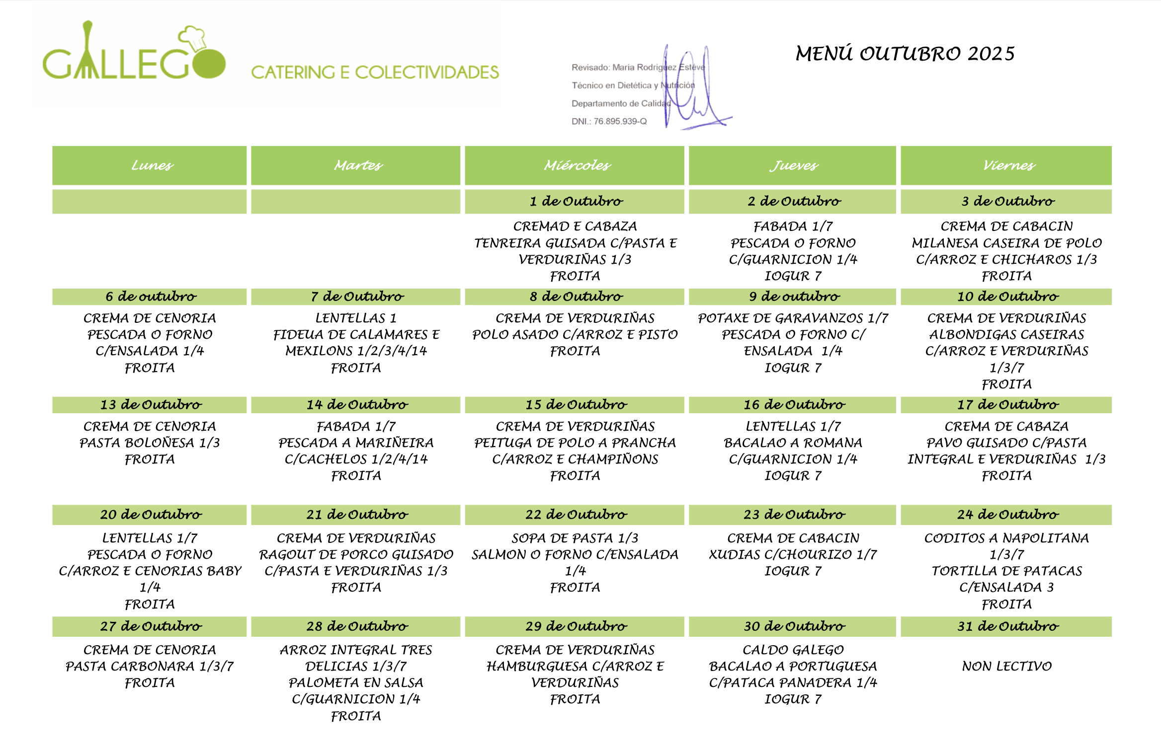 Información sobre alérxenos: 1. Glute; 2. Crustáceos; 3. Ovo; 4. Peixe; 5. Cacahuetes; 6. Soia; 7. Lácteos; 8. Froitos secos; 9. Apio; 10. Mostaza; 11. Sésamo; 12. Sulfitos; 13. Altramuz; 14. Moluscos.